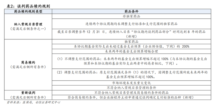 ②简易续约:独家药品;本协议期基金实际支出未超过基金支出预算(企业预估值,下同)的 200%;未来两年的基金支出预算增幅合理;市场环境未见重大变化;不符合纳入常规目录管理的条件;
