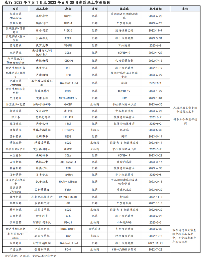 (1)29个在2022年7月1日至2023年6月30日之间新获批上市的创新药参加谈判:上述时间段中共有35个国产创新药(含引进)获批上市,其中30个创新药将有望首次参加医保谈判,其他包括恒瑞医药阿得贝利单抗、信达生物/驯鹿的伊基奥仑赛、赛生药业/Y-mAbs的那西妥单抗、红日药业的对甲苯磺酰胺、乐普生物的普特利单抗等5个创新药不在通过形式审查的申报药品名单中,预计将不参加今年医保谈判。