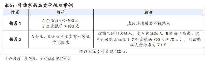 企业报价分别与医保支付意愿对比,只要有 1 家企业参与并报价不高于医保支付意愿,则该通用名药品纳入药品目录乙类部分,否则该通用名药品不纳入;如药品通过竞价纳入药品目录,取各企业报价中的最低者作为该通用名药品的支付标准,如企业报价低于医保支付意愿的 70%,以医保支付意愿的 70%作为该药品的支付标准。