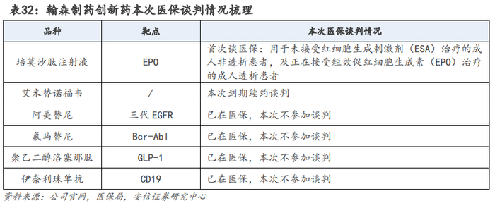 2)安进/协和麒麟制药:达依泊汀α目前获批透析成人CKD患者的贫血适应症,目前已在医保目录,今年不参加谈判。
