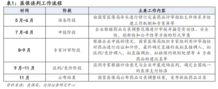 2023年6月29日,国家医保局公布《2023 年国家基本医疗保险、工伤保险和生育保险药品目录调整工作方案》,根据调整工作方案,2023年国家药品目录调整工作流程分为准备、申报、专家评审、谈判/竞价阶段、公布结果,共5个阶段,预计在11月进入谈判/竞价阶段。