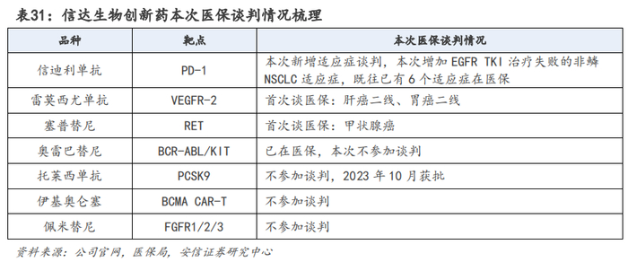 信达生物在本次医保谈判中有信迪利单抗等产品进行新增适应症谈判;有雷莫西尤单抗、塞普替尼等产品进行首次医保谈判。