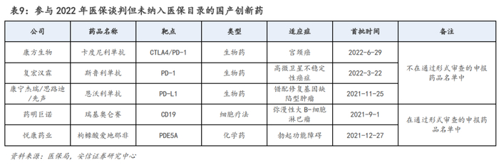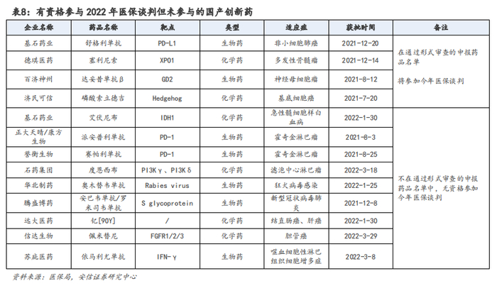 (2)4个有资格参与2022年医保谈判但未参与的国产创新药将参加本次医保谈判:2021年7月1日至2022年6月30日新获批上市创新药中共有13款创新药有资格参与2022年医保谈判但未参与,在本次公布名单中基石药业的舒格利单抗、德琪医药的塞利尼索、百济神州的达妥昔单抗β、济民可信的磷酸索立德吉等4款创新药在通过形式审查的申报药品名单中,将有望首次参加医保谈判。