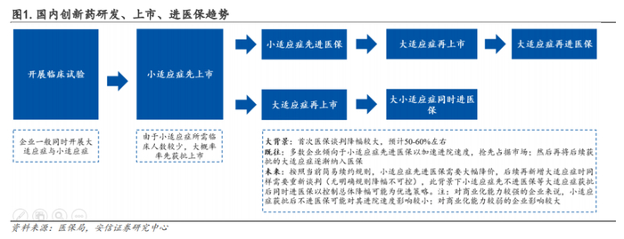 当前简易续约规则利于商业化能力较强的企业,对商业化能力较弱Biotech的产品的创新性、差异化、疗效提出更高的要求。按照当前简易续约规则,小适应症先进医保需要大幅降价,后续再新增大适应症时同样需要重新谈判(无明确规则降幅不可控),此背景下小适应症先不进医保等大适应症获批后同时进医保以控制总体降幅可能为优选策略。对商业化能力较强的企业来说,小适应症获批后不进医保可能对其进院速度影响较小;而对商业化能力较弱的Biotech企业,创新性、差异化、疗效更高产品才有竞争力。