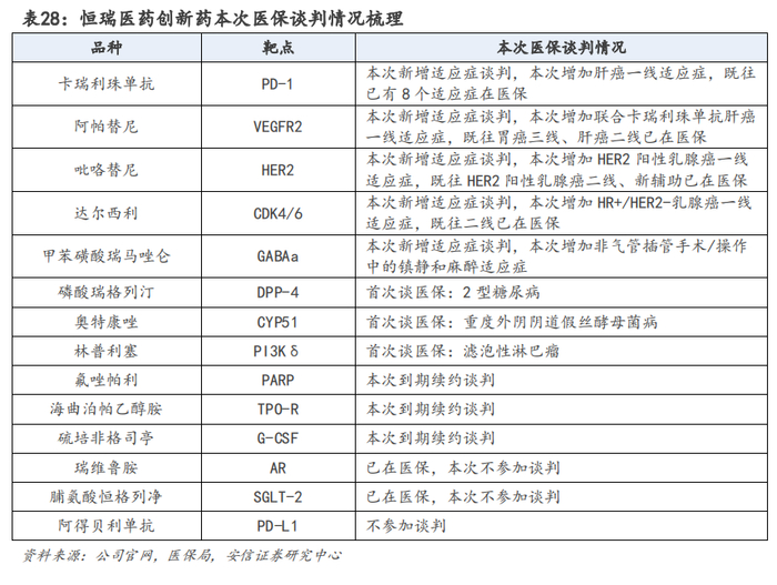 恒瑞医药在本次医保谈判中有卡瑞利珠单抗、阿帕替尼、吡咯替尼、达尔西利、甲苯磺酸瑞马唑仑等产品进行新增适应症谈判;有磷酸瑞格列汀、奥特康唑、林普利塞等产品进行首次医保谈判;有氟唑帕利、海曲泊帕乙醇胺、硫培非格司亭等进行医保到期续约谈判。