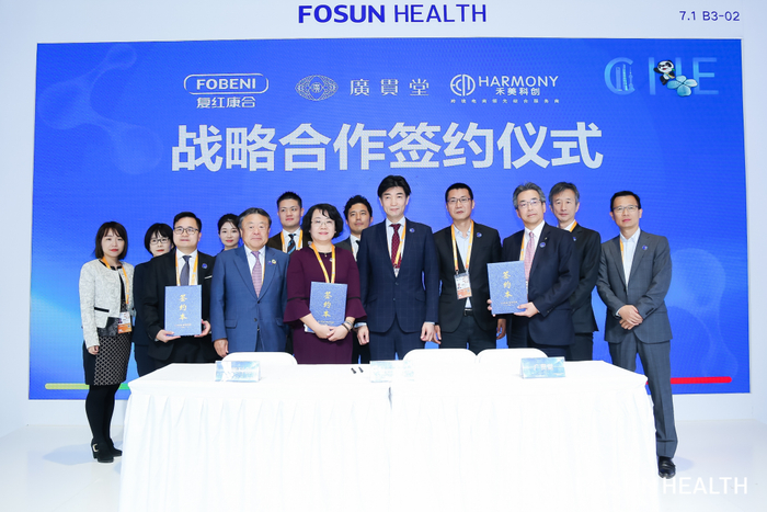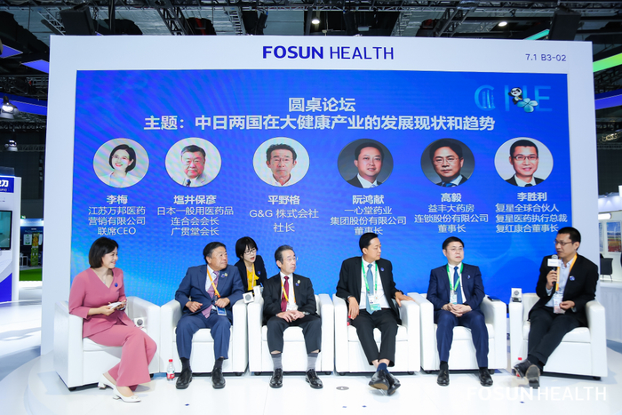 11月7日上午在第六届进博会上,由复星医药与复红康合联合主办的大健康产业论坛,围绕“中日两国在大健康领域的发展现状及趋势”开展了圆桌交流,并就日本百年品牌广贯堂的业务合作,复红康合、广贯堂、禾美科创三方签署了战略合作协议。日本一般用医药品连合会会长及广贯堂会长塩井保彦先生、日本G&G 株式会社社长平野格先生,一心堂药业集团股份有限公司董事长阮鸿献先生、益丰大药房连锁股份有限公司董事长高毅先生、以及复星医药执行总裁兼首席发展官、复红康合董事长李胜利先生、万邦营销联席CEO李梅女士等嘉宾出席了本次论坛。