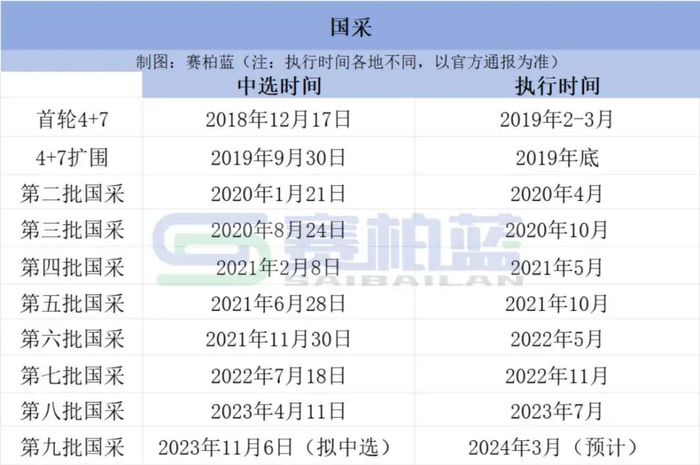 从国采的中选和时间看,基本是一年两批。执行时间间隔在4-9个月不等。具体到不同批次、不同省份,执行时间有所不同。