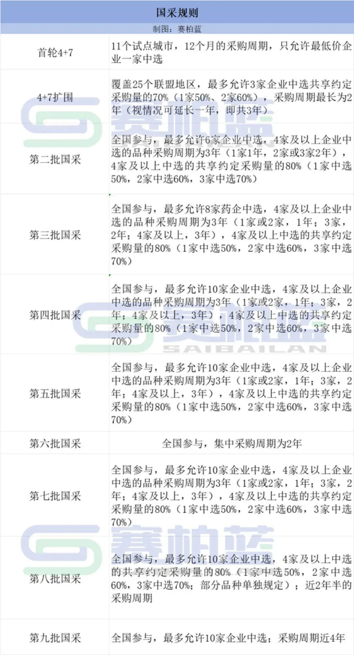 具体到规则,从第四批国采开始,基本稳定在全国参与,最多允许10家企业中选,4家及以上企业中选的品种采购周期为3年(1家或2家,1年;3家,2年;4家及以上,3年),4家及以上中选的共享约定采购量的80%(1家中选50%,2家中选60%,3家中选70%)。