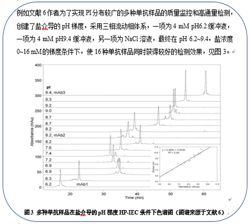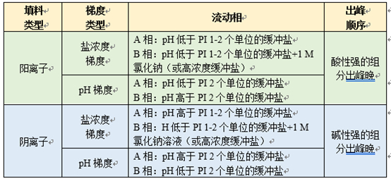 ①在盐浓度梯度条件下,pH为单一值,多为PI±1。阴离子模式下,pH为PI+1,因为阴离子交换柱填料带正电荷,当流动相pH高于PI时待分析物带负电荷,可以与柱填料产生相互作用而被保留,然后随着盐浓度增加逐渐解析下来;相反,阳离子模式下,pH为PI-1,因为阳离子交换柱填料带负电荷,当流动相pH低于PI时待分析物带正电荷,可以与柱填料产生相互作用而被保留,然后随着盐浓度增加逐渐解析下来。