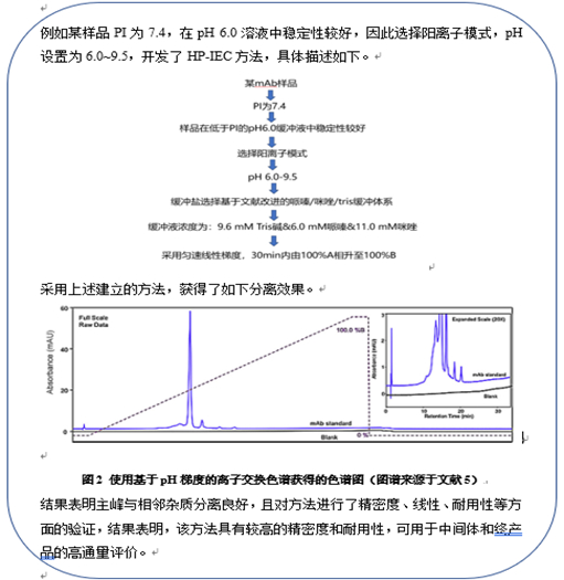 与纯化不同,在质量控制的方法开发中,对于待分析组分是否保持活性并不十分关注,只要确保仪器、色谱柱能耐受,pH设置范围可以更宽,因此对于采用阴离子交换模式还是阳离子交换模式并没有明显的规律。例如某样品PI为5,可以选择阴离子交换模式,pH设置为6进行盐梯度洗脱或pH设置为7~3进行pH梯度洗脱,也可以选择阳离子交换模式,pH设置为4进行盐梯度洗脱或pH设置为3~7进行pH梯度洗脱。