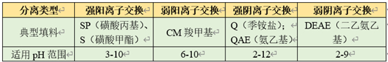 在离子交换色谱中色谱柱类型也代表分离模式,包括阳离子交换和阴离子交换两种。其中又可细分为强阳离子交换、弱阳离子交换、强阴离子交换和弱阴离子交换。阳离子交换柱色谱柱填料本身带负电荷,阴离子交换柱填料本身带正电荷。典型的固定相填料及适用pH范围见表1。