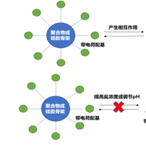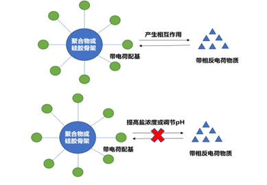 首先使待分析物和固定相带有不同电荷,产生相互作用,然后通过增加离子强度破坏两者的相互作用(盐浓度梯度)或者调节pH改变待分析组分表面电荷(pH梯度)来打破这种离子相互作用,实现洗脱目的,见图1。