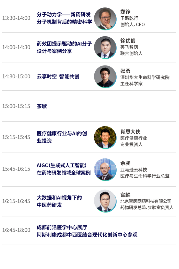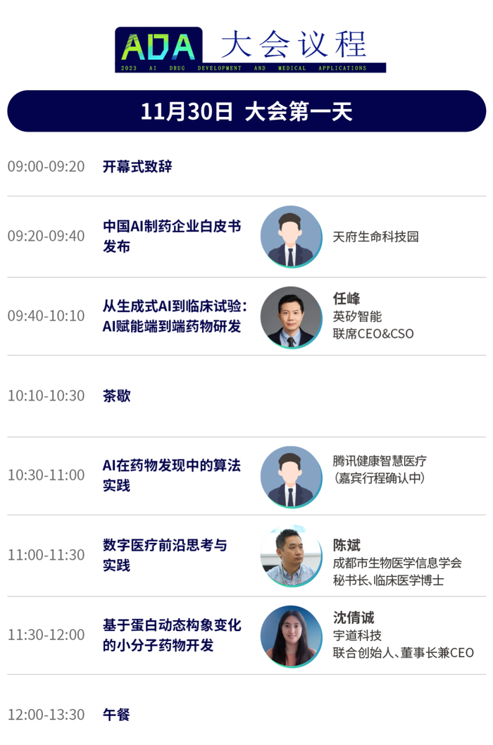 “人工智能药物开发及医疗应用论坛”将于2023年11月30日-12月1日在成都前沿医学中心举办,活动当日将有走进阿斯利康、《中国AI制药企业白皮书》发布等活动及十余位医疗领域和药物研发领域的专家,共同探讨人工智能在医学和药物研发领域的前沿技术和创新应用,深入了解医药大健康产业数字化未来趋势及目前的创新技术。