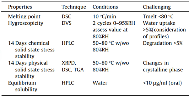 同种药物分子不同晶型存在诸多性质的差异,在晶型筛选过程中如何设置标准就显得至关重要。图3展示了赛诺菲-安万特固态科学家有关早期药物开发中比较关注的药物性质的一些标准以及相关的表征手段,通常考量的药物性质如药物物理化学稳定性,熔点,溶解度,引湿性,晶癖,流动性,可压性,体内生物利用度以及可生产性等。