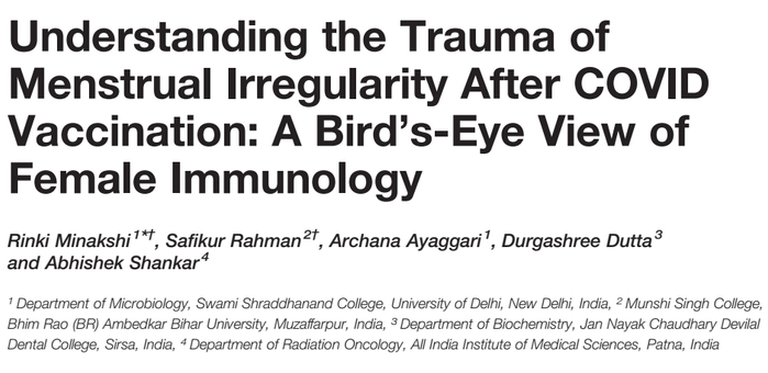 参考文献:Minakshi R, Rahman S, Ayaggari A, Dutta D, Shankar A. Understanding the Trauma of Menstrual Irregularity After COVID Vaccination: A Bird's-Eye View of Female Immunology. Front Immunol. 2022 Jun 13;13:906091. doi: 10.3389/fimmu.2022.906091. PMID: 35769462; PMCID: PMC9234113.