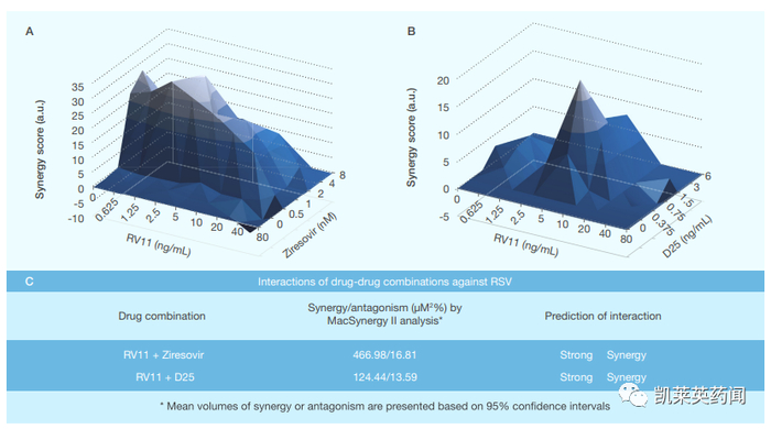 最后,RV11与小分子抗病毒药物ziresovir,以及D25的mAb结合,表现出强大的协同作用。