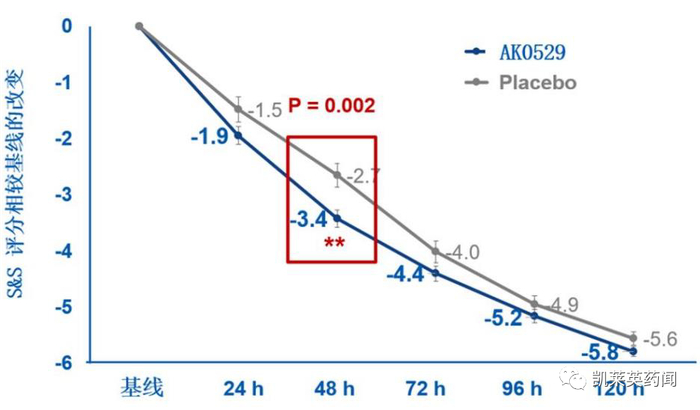 AK0529 Ⅲ期临床试验治疗组与安慰剂组和临床体征和症状(S&S)评分对比情况