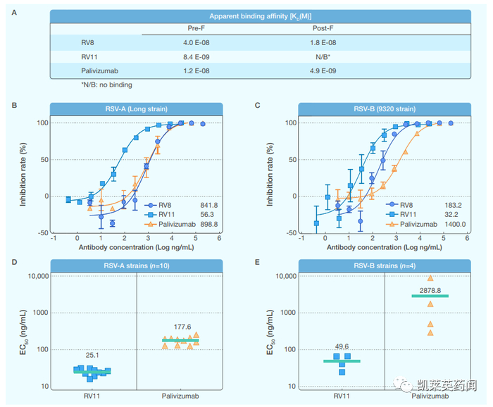 RV11与RSV菌株的体外结合效力,相较于帕利珠单抗高7至58倍。