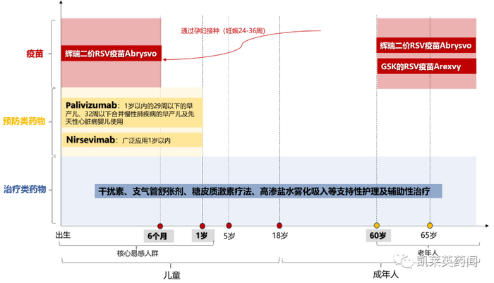 在疫苗方面,6 个月内的婴儿可通过孕妇在妊娠24-36 周时主动接种辉瑞二价RSV 疫苗Abrysvo 疫苗来预防患上RSV 相关下呼吸道疾病;60 岁及以上人群可通过接种GSK 的RSV疫苗Arexvy 或辉瑞二价RSV 疫苗Abrysvo 来预防因感染RSV 引发的下呼吸道疾病(LRTD);其他年龄阶段的人群暂无相关已上市的RSV 疫苗。