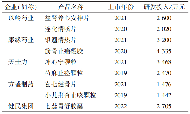 相对于化学药和生物药,中药领域研发投入相对偏低,增加研发投入已经成为业内本阶段的主要发展趋势。在2022 年 A 股 75 家中药企业公布三季报的公司中,研发投入金额排前 5 名的企业(简称)分别为:白云山(6.64 亿元)、天士力( 5.91 亿元)以岭药业(5.52 亿元) 康缘药业(4.37 亿元)华润三九(3.53 亿元),见表 1。多数中药企业的研发投入占营业收入比重低于 5%,处于较低水平。康缘药业 2021 年营收占比为 13.69%,位居首位,但仍低于以创新化药和生物药研发为主的恒瑞医药的研发投入(2018-2021 年营收占比为 15.33% ~22.94% )中药的研发成本相对较低,一般而言,单个中药创新药品种需要的研发费用在千万元左右。分析中药头部企业 2019-2022 年获批的9 款产品的研发投入显示,单个产品的研发总投入在1000~5000万元平均为2635万元[2-13],见表2。
