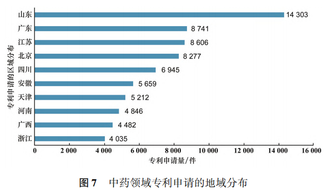 国内中药领域专利申请区域排名以山东省居于首位,广东省、江苏省、北京市、四川省、安徽省、天津市、河南省、广西壮族自治区、浙江省也是申请量靠前的省市,见图 7。