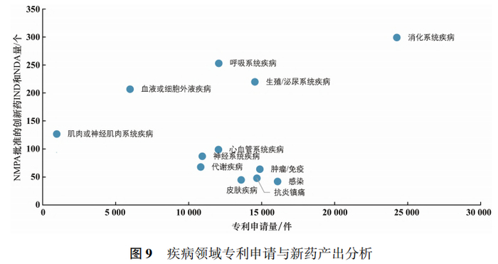 在肿瘤/免疫制剂、感染、抗炎镇痛及皮肤疾病等领域,创新的投入与产出比例尚小,新药研发的难度比较大。消化系统疾病、感染、肿瘤/免疫、抗炎镇痛、生殖/泌尿系统疾病是专利申请涉及较多的疾病领域。从 2002-2021年批准的中药创新药 IND 及 NDA 看,这些药物涉及前五大治疗领域是消化系统疾病、呼吸系统疾病、牛殖/泌尿系统疾病、血液或细胞外液疾病以及肌肉或神经肌肉系统疾病,见图 9。