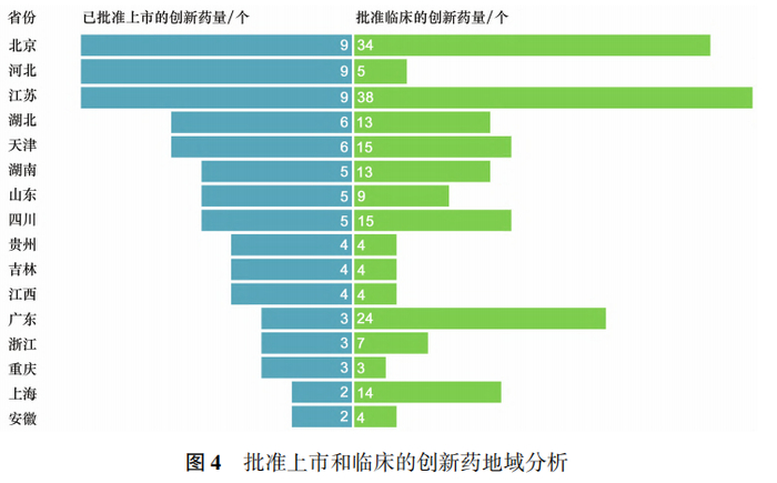 从地域看,2011-2022 年 10 月批准的88个创新药中,北京市、河北省与与江苏省的公司上市药物量最多,均为 9个,并列全国第一位;在此期间批准临床的创新药共计 281 个,以江苏省和北京市居多,超过 30 个。河北省的公司虽然在此阶段新药上市量居首,但新药临床量却并未在第一梯队( 见图 4)。