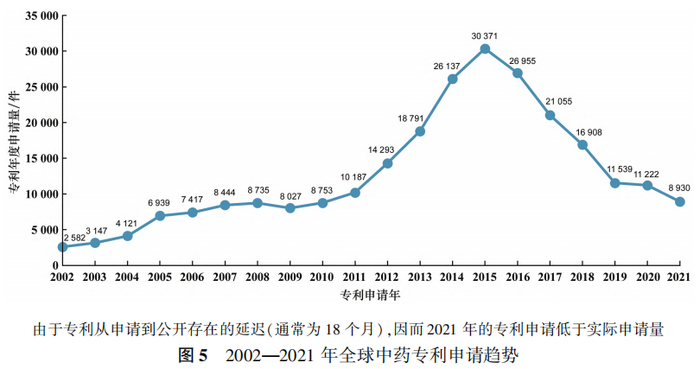 全球中药专利申请的年度申请量由 2002 年的2 582 件增长到 2015 年的约 3 万件 随后一直处于下降趋势.2020 年的年度申请量为 1.1 万件,见图5。