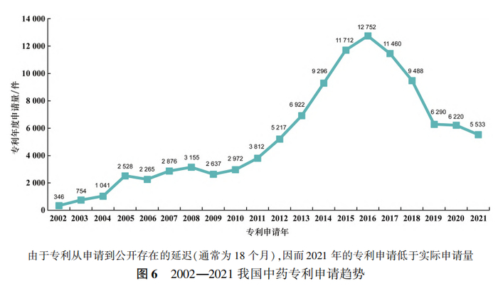 2002-2021 年,我国中药专利申请形成了明显的:阶段发展态势。中药专利申请量在 2002-2011年期间缓慢增长,在 2012-2016 年期间呈现出快速增长的趋势,2017 年后年申请量开始逐渐下降( 见图 6)。专利申请量先升后降,反映了我国在中药领城由专利弱国向数量大国进而向高质量大国的转变过程。