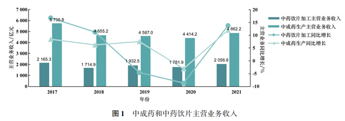 2017一2020 年间.我国中药主营业务收人呈下滑态势,而在 2021 年实现了恢复性增长。2021 年中药工业主营业务收人达到6919亿元,占医药工业总主营业务收人的 21.3%利润总额为 1004 亿元。其中,中成药生产主营业务收入为 4862.2 亿元.同比增长 11.9%:中药饮片加工为 2056.8 亿元,同比增长 13.7%(见图 1)。中药行业竞争力增强,实现高质量增长。