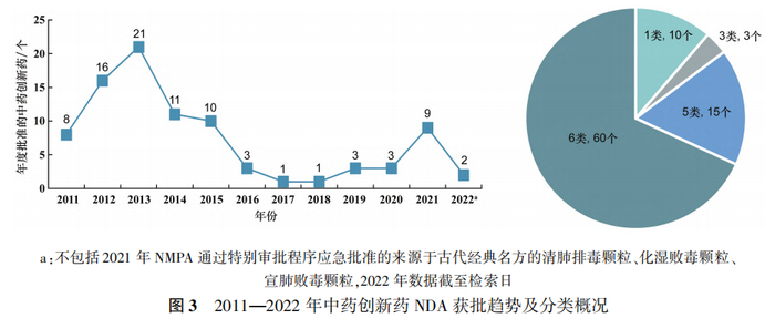 截至 2022 年 10 月2022 年国家药品监督管理局(NMPA)共批准了2款中药创新药上市,分别为广金钱草总黄酮提取物和阿可拉定(淫羊董素)。而在2021年,NMPA 共批准了 9 个创新药,此外还有3个通过特别审批程序应急批准的来源于古代经典名 方的清肺排毒颗粒、化湿败毒颗粒、宣肺败毒颗粒[ 14]中药临床申请(IND)和上市申请(NDA)的申请品种适应证相对集中,集中在呼吸系统疾病、消化系统疾病、神经系统疾病、妇科病和心血管系统疾病 5个治疗领域,其他治疗领域的申报量相对较少,这与近年来中成药市场的占比也较为一致。自 2011 年至2022 年 10 月NMPA 已批准了 88 个中药创新药,NDA 批准量自2013 年达顶峰之后,一直呈下降趋势,但 2019 年之后在不断复苏.且审评速度在不断加快。这 88 个创新药中,10 个为 1类中药、3 个为3 类中药、15 个为5 类中药、60 个为6类中药,见图3。