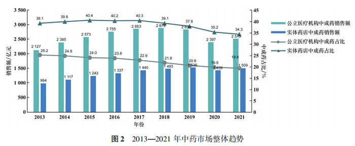 2021 年,我国公立医疗结构( 包括城市公立医院、城市社区医院、县级公立医院、乡镇卫生医院)和零售实体药店中成药销售额均有所上涨,整体市场达4024亿元[12]。其中公立医疗机构的中成药销售额为2515亿元,占总体公立医疗药品销售的19.4% ;零售实体药店中成药销售额达1509亿元占药店总体零售销售额的34.3%(见图 2)。公立医疗机构中成药销售额在2018年见顶,且占比持续下滑,可能原因是 2017 年版医保目录对多款重磅中药注射剂附加了医保限制。