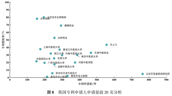 2002-2021 年,我国中药行业专利申请人中,天士力的专利申请量和授权率均较高,康缘药业、北京亚东生物制药、以岭药业和步长制药的专利申请量虽不属于第一梯队,但授权率较高,创新能力居于前列:国内多所高校如上海中医药大学、黑龙江中医药大学的专利授权率也居于前列。北京艺信堂医药研究所以 763 件的专利申请量居于申请人排名首位,但其专利授权率仅有5%,见图8。创新力居于前列的申请人的疾病布局方向各有不同,如北京亚东生物制药重点布局的适应证是呼吸系统疾病和生殖系统疾病;步长制药重点布局领域为心血管系统疾病与消化系统疾病;康缘药业在消化道疾病和呼吸系统疾病有较多的专利布局;以岭药业的重点布局方向为心血管系统疾病神经系统疾病与代谢疾病;天士力重点布局领域为心血管系统疾病、肿瘤和神经系统疾病。但总体而,这些企业/机构的专利布局方向与其产品线较为致,尚不丰富。