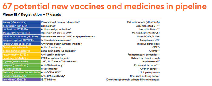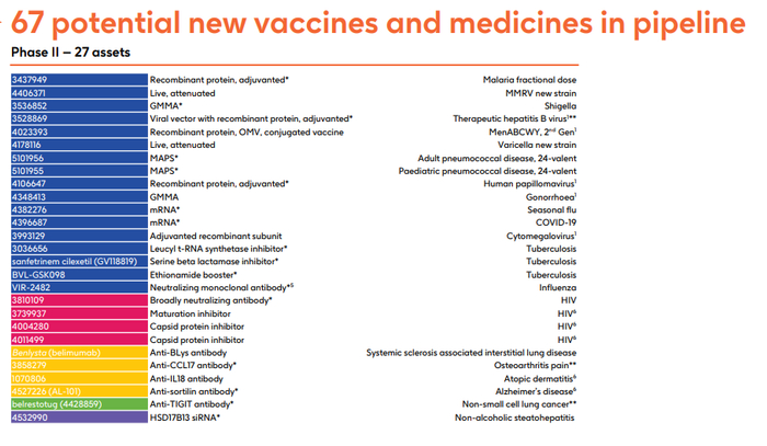 此外,GSK披露了创新产品管线储备,多达67款在研创新型疫苗及药物正在开发中。从临床分期来看,临床I期23项,临床II期27项,临床III期17项。