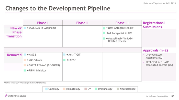 2023年9月14日上午9时百时美施贵宝在纽约举办研发日,宣布出于功效和安全问题,BMS终止了两个2期项目和四个1期项目的开发,包括CD47xCD20双抗、治疗AML的GSPT1分子胶,以及作为自身免疫性疾病治疗的RIPK1抑制剂和治疗NASH的siRNA疗法热休克蛋白47(HSP47) 。