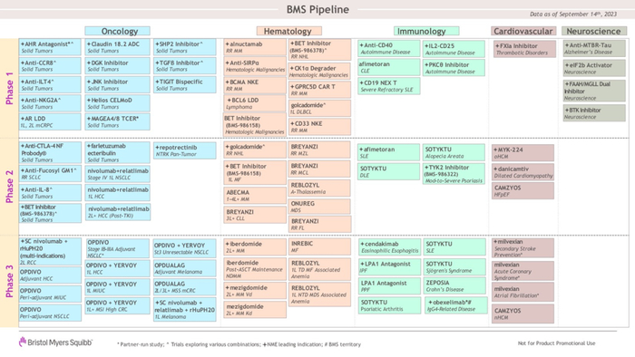 此次更新的管线布局多数分布在肿瘤领域,开始逐渐扩展神经科学领域。新增加的管线进展包括靶向CD19的NEX-T细胞疗法BMS-98635拓展到免疫疾病的临床试验,靶向 GPRC5D的细胞疗法 CAR-T BMS-986393 启动复发/难治性多发性骨髓瘤注册试验,靶向BCMA x CD3 的T细胞接合剂 alnuctumab 进入临床III期试验,蛋白降解剂 golcadomide进入一线大B细胞淋巴瘤的临床III期试验,以及BET抑制剂 BMS-986158 用于治疗骨髓纤维化进行概念验证等等。