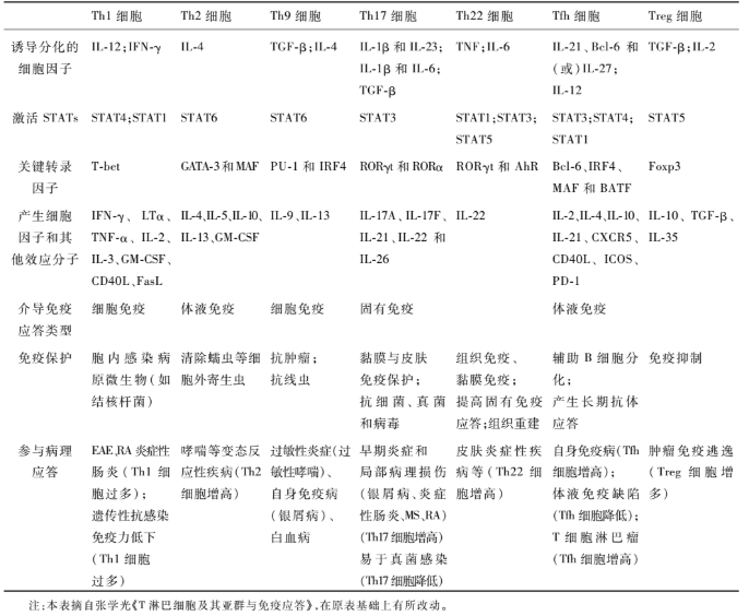 表1.CD4+Th细胞亚群的主要特性和功能