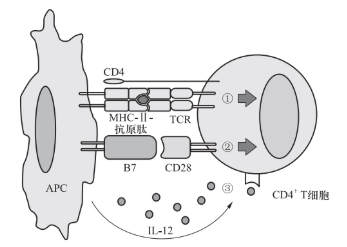 T细胞的活化遵循双信号原则。APC提呈的抗原肽-MHC分子复合物与TCR作用提供T细胞活化的第一信号;APC表面共刺激分子(B7)与T细胞表面共刺激分子(CD28)作用,提供T细胞活化的第二信号。APC与T细胞相互作用,同时激活APC分泌细胞因子IL-12、IL-4等;与T细胞表面IL-12R、IL-4R相互作用,提供T细胞活化的第三信号(图2.11)。缺乏共刺激信号使T细胞处于失能(anergy)状态;而缺乏细胞因子(第三信号)则使T细胞不能充分活化、增殖与效应。