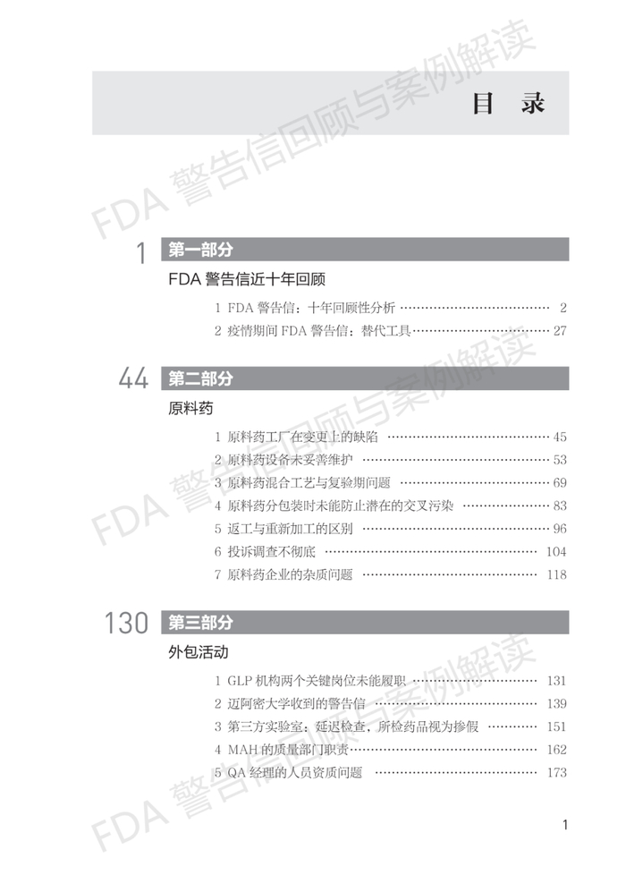 在本汇编中,对FDA警告信近十年的情况进行回顾并收录2022年38封GMP相关的警告信。书籍共分六个部分,每封警告信均有翻译和解析,包括原料药、生物制品、无菌制剂及其他成品制剂等。通过学习这些案例,我们可以更好地理解国际医药行业面临的挑战和问题。