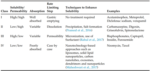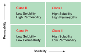 图1.BCS分类系统图示,根据药物的渗透性和溶解性对药物进行分类。当存在于最高浓度速释制剂中的药物量在胃肠道pH值(1.2-7.5)的可能范围内可溶于250毫升水中时,化合物被定义为高溶解性。高渗透性化合物定义为吸收率为>90%或通过体外或体内方法评估的渗透性等于或高于吸收率为90%的参考化合物的化合物。(来源于参考文献1)
