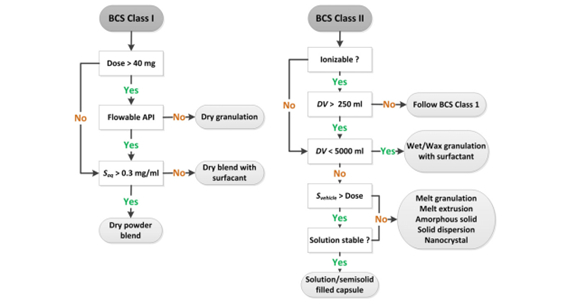 对于每种制剂方法,都有几种工艺技术可用于制造药物产品。关于如何从战略上进行,当然需要指导,一个好的起点确实是BCS分类系统(图5)。当化合物水溶性看起来相当没有问题,即>0.3mg/ml时,根据剂量和流动特性,将BCSI化合物物配制成简单的粉末混合物。如果不满足溶解度标准,则用表面活性剂配制干混合物。在流动性问题的情况下,优选使用压辊压实(RC)将药物制粒。