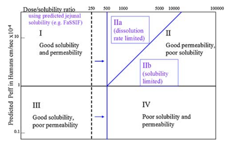 改良版本的BCS分类系统,即“可开发性分类系统”(DCS),其考虑了生物相关的溶解度(在FaSSIF中)以及以目标药物粒度表示的溶出速率。此外,在DCS中使用了溶解度限制可吸收剂量(SLAD),这改变了先前报道的最大可吸收剂量的概念。生物相关溶解度通常高于相应的水溶液值,并且考虑增加胃肠液体积(500ml)用于药物溶解。因此,BCS的溶解度分界线在DCS中被转移到更高的极限,以区分药物类别。可开发性系统根据药物吸收的溶出限制(IIa)或溶解度极限(IIb)进一步区分II类化合物。这种定义对于处方的选择是有意义的。尽管DCS已被引入作为一种可开发性评估工具,具有一定溶出限制的BCSII化合物可以用基于颗粒尺寸减小、湿法制粒和/或添加表面活性剂的相当简单的处方来开发。然而,DCSIIb类别中的其他BCSII化合物可能需要使能处方,例如LBF或ASD。似乎,为了选择基于生物药剂学分类系统的早期处方策略,DCS提供了一个比BCS更详细的开发方向。