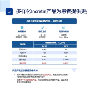 HRS9531是一款靶向GIPR/GLP-1R的在研新药。GLP-1和GIP是两种天然的肠促胰素,研究表明GIP可以减少食物摄入、增加能量消耗,从而减轻体重。当GIP与GLP-1受体激动剂联合使用时,可能会对患者血糖和体重产生更大的影响。2023年5月5日,CDE官网显示,恒瑞医药1类新药HRS9531注射液已获批临床,用于减重。目前,HRS9531肥胖和2型糖尿病的2期临床试验正在积极推进中。