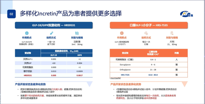 慢病管理方面,恒瑞共有58款创新产品在研。在降糖/减重领域,GLP-1R/GIPR双激动剂HRS9531、口服GLP-1小分子HRS-7535在会上进行了重点介绍,体现了恒瑞医药对于这个千亿市场的重视。