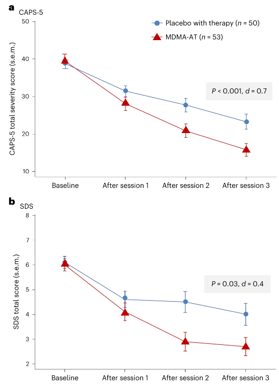 MDMA辅助治疗组患者CAPS-5评分的最小二乘(LS)平均变化为-23.7(95% CI:-26.94,-20.44),安慰剂治疗组为-14.8(95% CI:-18.28,-11.28,P<0.001)。MDMA辅助治疗组SDS评分的LS平均变化为-3.3(95% CI:-4.03,-2.60),安慰剂治疗组为-2.1(95% CI:-2.89,-1.33,P=0.03)。7例受试者发生了重度治疗伴发不良事件(TEAE),包含5例于MDMA-AT组(9.4%),2例于安慰剂组(3.9%)。