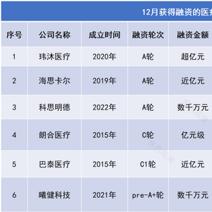除了上述公司,还有其它创新医疗器械公司也在今年12月完成融资,限于篇幅,本文不再一一介绍。希望在资本的助力下,这些公司可以加快创新产品的研发进度,早日为广大患者带来新的治疗选择。