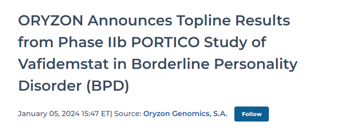 2.https://www.globenewswire.com/news-release/2024/01/05/2804854/0/en/ORYZON-Announces-Topline-Results-from-Phase-IIb-PORTICO-Study-of-Vafidemstat-in-Borderline-Personality-Disorder-BPD.html