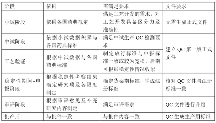 成品质量:根据各国药典及相关指导原则综合制定,检测方法优选药典方法,若制定新的检测方法,需证明新方法不劣于药典方法。