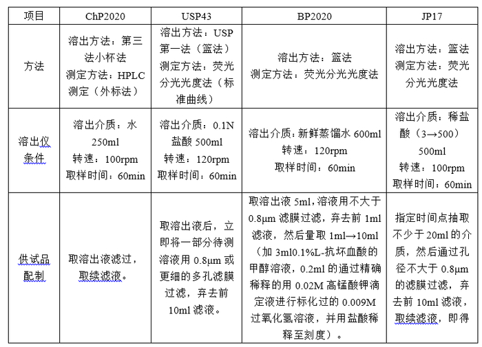 具体实例2:某小规格片剂溶出度检测方法各国药典对比如下: