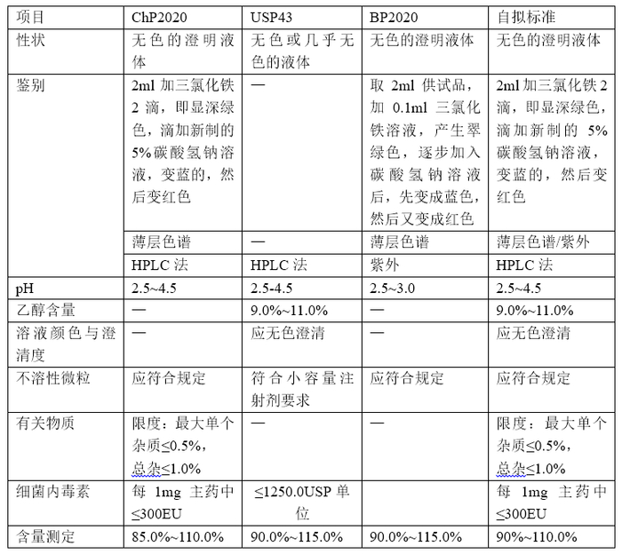 质量标准拟定依据:根据注射液一致性评价技术要点,制剂的质量标准应不低于各国药典标准,综合此品种各国药典所述,制定质量标准如上表所示。应注意pH值标准与制剂处方相关,因研究用参比制剂为美国上市,与欧洲上市的制剂处方略有不同,故此品种pH值的质量标准根据参比制剂的说明书制定。